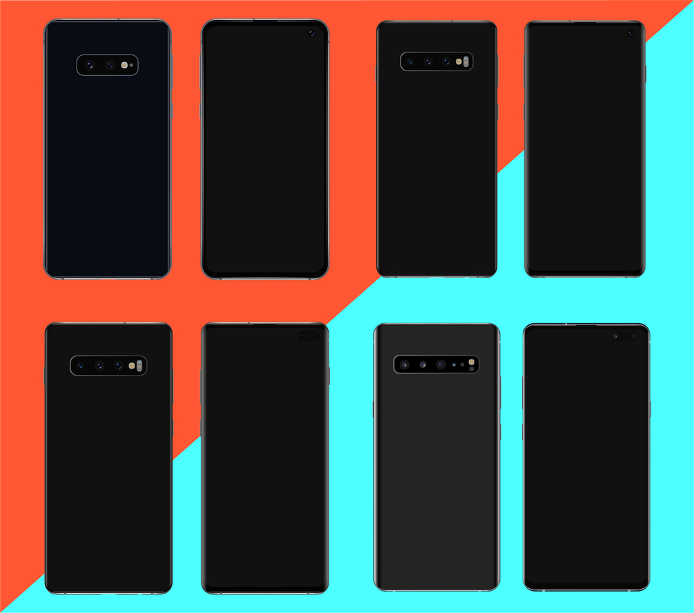 Galaxy S10 Mockup set. Galaxy S10 5G, S10 Plus, S10, S10e. AI, PSD, PNG files.
